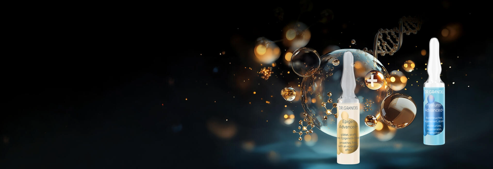 So sorgen die Hyaluron Advanced+ Ampullen mit 10 verschiedenen Hyaluron-Arten für ein pralles, regeneriertes & gestärktes Hautbild. Die Epigen Advanced+ Ampullen mit Epigenetik-Effekt enthalten eine innovative Wirkstoffkombination für ein verjüngtes Erscheinungsbild der Haut. Entdecke die High Performance Luxus Ampullen von DR. GRANDEL für Dich: Die allumfassende Anti-Aging Lösung gegen die Zeichen der Zeit.