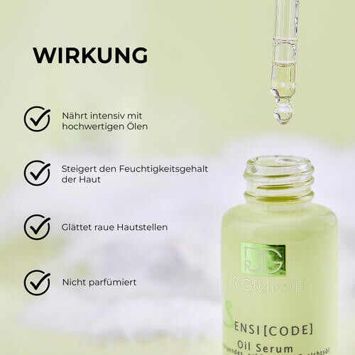 Profi-Tipp: Verwenden Sie im Anschluss an das Gesichtsöl eine passende Creme aus der Serie Sensicode von DR. GRANDEL. Das Öl Serum und die passende Sensicode 24-Stunden-Pflege bilden eine optimale Kombination zum Aufbau und intakthalten der Hautbarriere und des Hydro-Lipid-Mantels.
