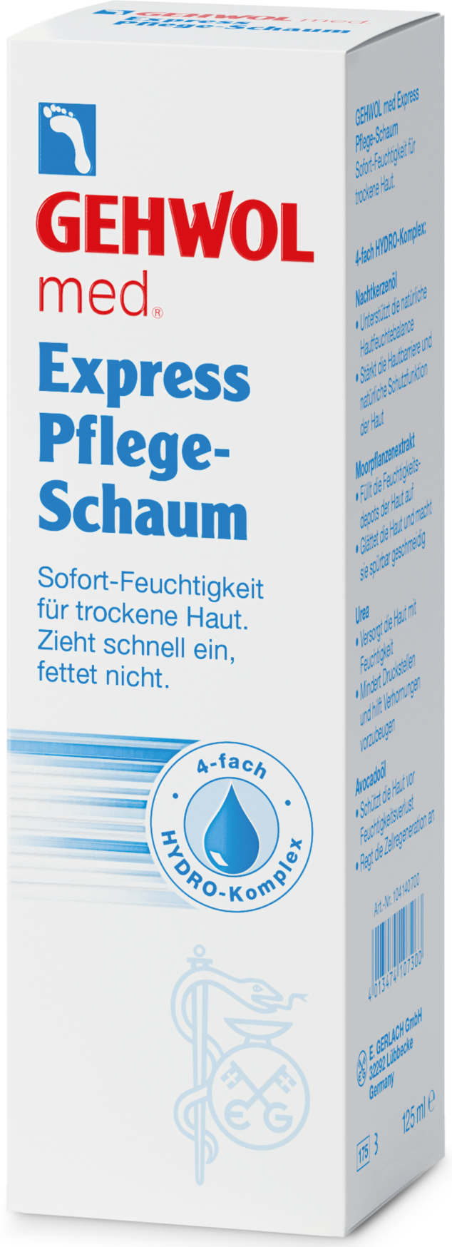 GEHWOL med Express Pflege-Schaum wurde für die Basis-Pflege normaler bis trockener Haut entwickelt. Mit einer kleinen Menge des ergiebigen Schaums sind die Füße täglich, morgens und abends, in Express-Geschwindigkeit gepflegt. GEHWOL med Express Pflege-Schaum zieht schnell ein und fettet nicht. Für spürbar geschmeidige, gepflegte Füße und ein angenehmes Hautgefühl. Ein guter Anfang, einem wichtigen Teil unseres Körpers Aufmerksamkeit und Wertschätzung zu schenken. GEHWOL med Express Pflege-Schaum ist dermatologisch geprüft. Er ist frei von Parabenen, Silikonölen und PEG-Emulgatoren sowie unparfümiert. Das Produkt ist auch für Diabetiker geeignet.